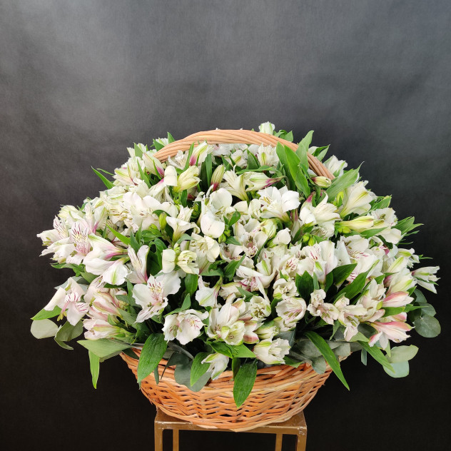 Завораживающая корзинка с нежной белой альстромерией. Чувственный подарок любимому человеку.
