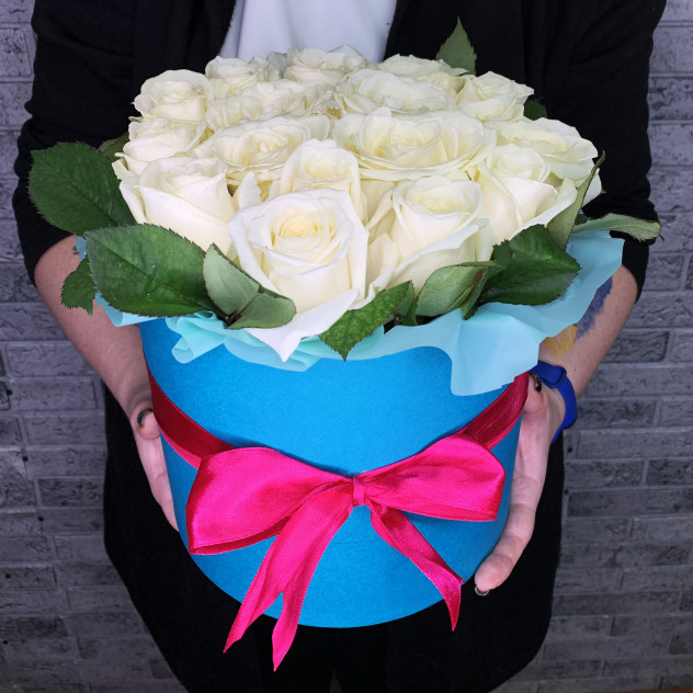 Прекрасный букет из белых роз в шляпной коробке подойдет для подарка