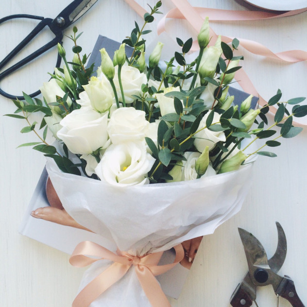 Лизиантус 7шт., Эвкалипт 3шт., Бумага тишью