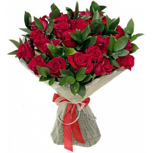 Состав: Роза красная 60 см 35шт., Упаковка для букета: натуральная сетка-джут, Рускус 20шт.