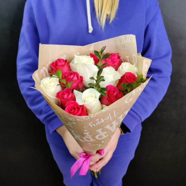 Букет из нежных роз и зелени, сообщает о чувстве благодарности к получателю подарка! Состав Самшит - 3 шт. Роза одноголовая - 15 шт. Лента - 1 шт. Пленка - 2 шт.