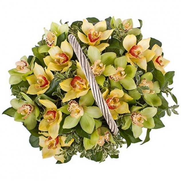 Состав: Упаковка (пленка с лентой), Фисташка 7шт., Орхидея цимбидиум (колокольчик) 25шт., Салал 10шт., Корзина плетеная, Пиафлор (оазис) 3шт.